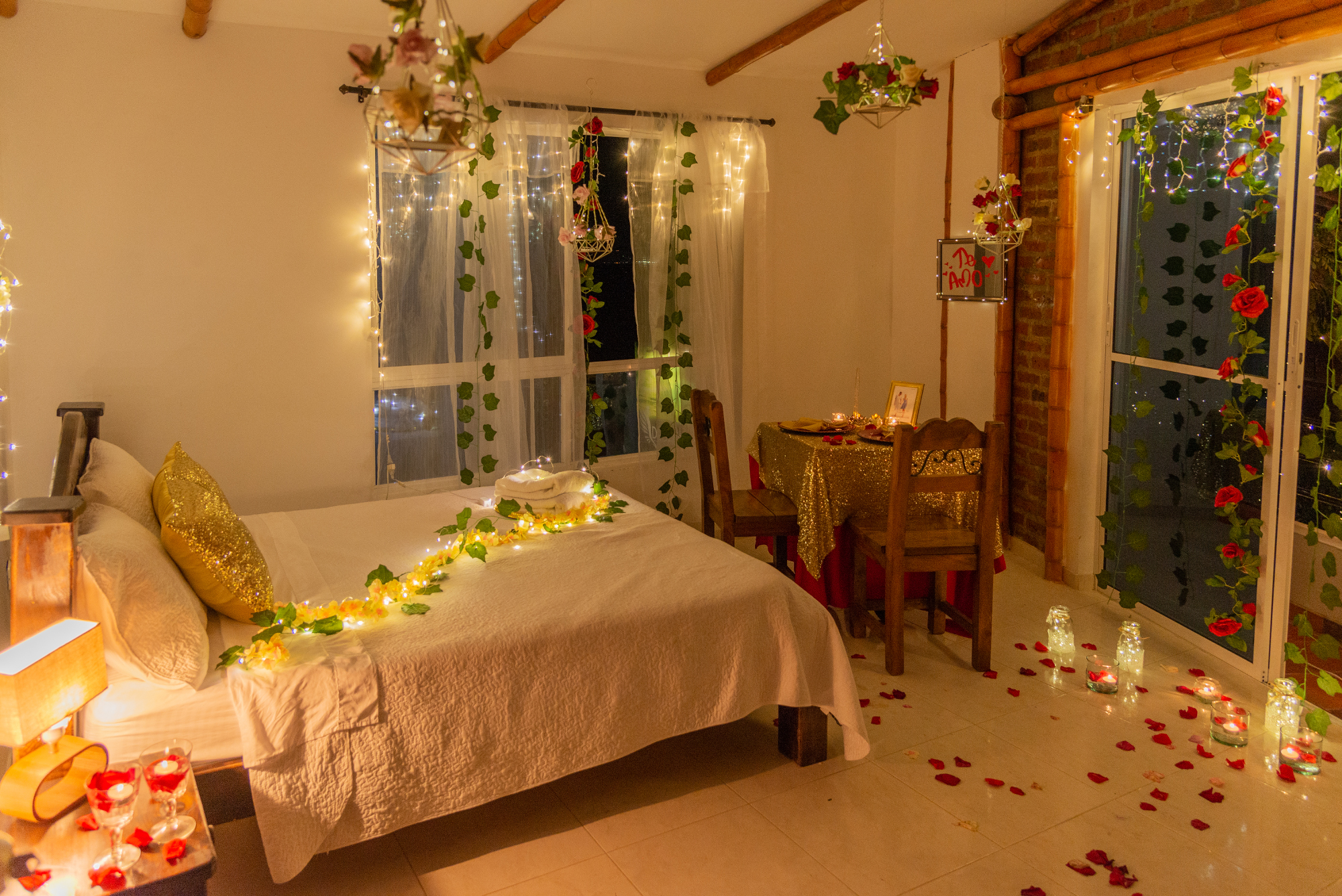 ✅ decoración de la hab con cojines decorativos, luces cálidas, canastas de flores colgando del techo, enredaderas de florez cayendo de las ventanas, candelabros y velitas.